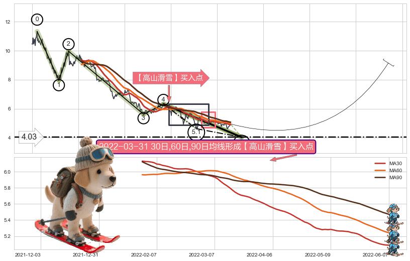 ➣ 高点影线(2022-03-18: 5.32 )→回踩→第一根k线低点(2022-03-14: 5.29 )