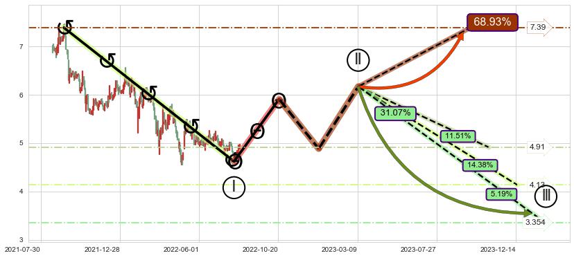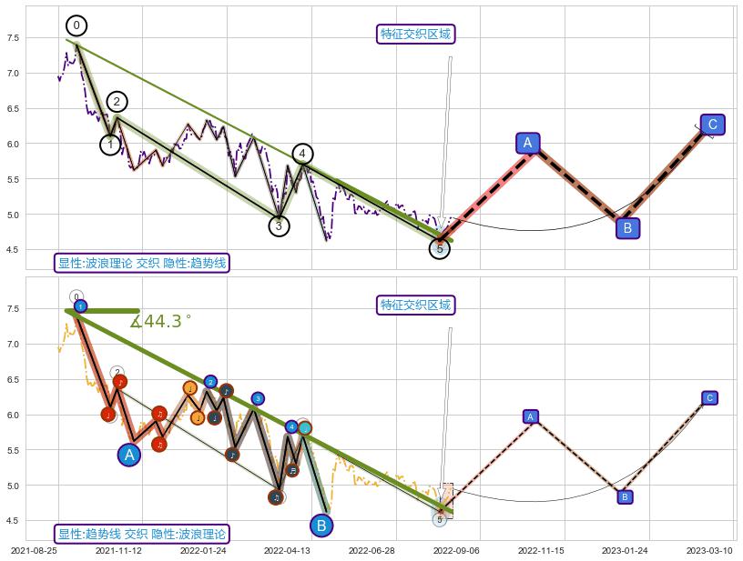 ➣ D点拟合预测价格6.09,距离最后交易收盘价格4.95相差 +23.12%