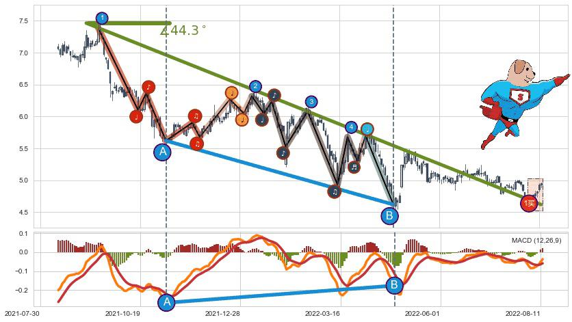 ⚔️ 2021-09-01-2022-05-09下跌趋势存在反转上涨[机会],其原下跌趋势的阻力位(4.62)已被突破[强支撑信号],原下跌趋势角度: 44.3˚