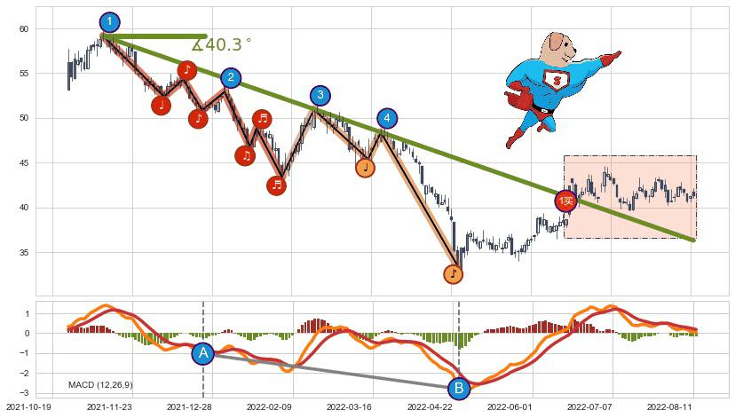 ➣ 2021-11-10-2022-05-20下跌趋势存在反转上涨[机会],其原下跌趋势的阻力位(36.30)已被突破[强支撑信号],原下跌趋势角度: 40.3˚
