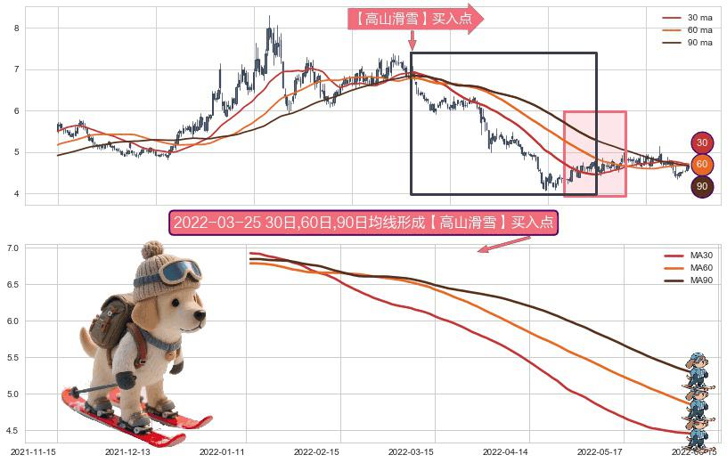 ⚀ 2022-01-12日-2022-06-07日显现 30日-60日-90日均线 【高山滑雪】买入点 看多信号,后市看涨,买入