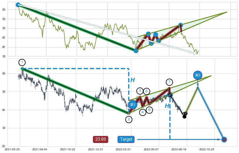 ➢ 最小中继整理跌幅→𝐇: 24.65 (𝐇楔型旗杆的长度:楔型起点→顶点)