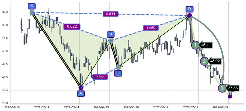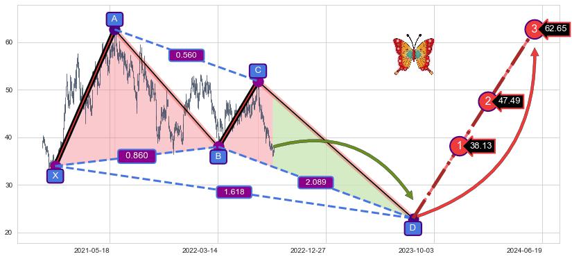 ➣ 未完成【蝴蝶】形态起点X: 2020-12-14, 已到达C点: 2022-07-04, 预测最终D点: 2023-08-09, 共661交易日
