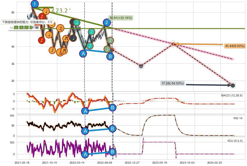 ♘ 在最后的下跌阶段2021-05-31至2022-08-12,存在 持续未破位的阻力位 ,阻力价格50.61,可信任强度77.09%,其距离最后价格38.01相差 +33.16%
