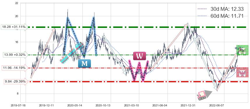 ♘ 阻力价格位18.28,可信任强度91.73%,距离最后交易2022-08-12形成的收盘价格13.94相差 +31.11%
