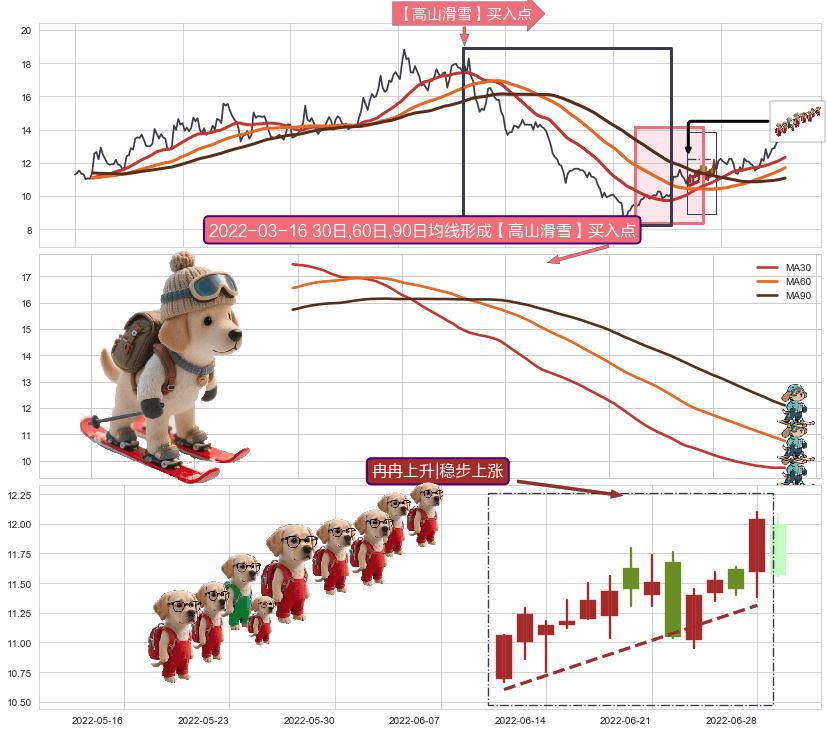 | 7 🅚:两红夹一黑 ➕ 🎢:【高山滑雪】买入点均线组合买入点信号形成后,猜想后续下行结束,持续反弹上涨(均值回复) ☞ 看多信号 ⇥ 【均线】交织【🅚线】⇥ 综合量化分数: 56 | > |