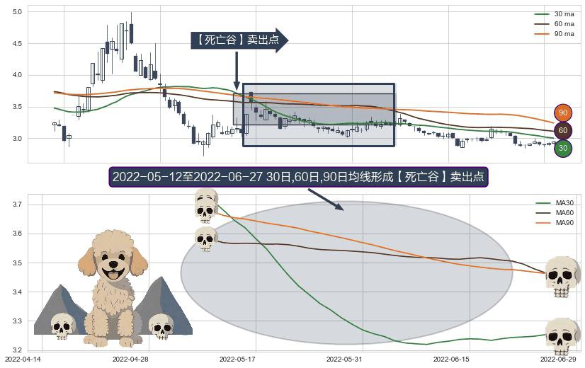 ⚀ 2022-05-13-日至2022-06-27-日显现 30日-60日-90日均线 【死亡谷】卖出点 看空信号,后市看跌,卖出