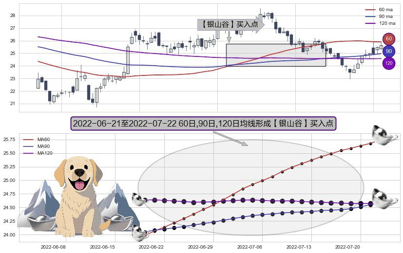 ⚀ 2022-06-22-日至2022-07-22-日显现 60日-90日-120日均线 【银山谷】买入点 看多信号,后市看涨,买入