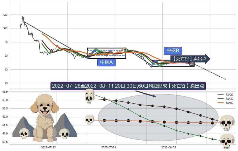 | 8 🅚:下跌两颗星 | 下跌三颗星 ➕ 🎢:【死亡谷】卖出点均线组合卖出点信号形成后,猜想后续破位下跌,沿着向下的尖头三角下跌 ☞ 看空信号 ⇥ 【均线】交织【🅚线】⇥ 综合量化分数: 49 | > |