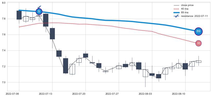 下跌趋势2022-07-06-2022-08-12,均线89确认关键阻力1处