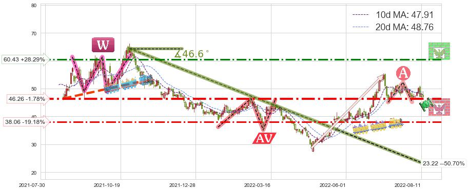 ♘ 支撑价格位46.26,可信任强度80.60%,距离最后交易2022-08-12形成的收盘价格47.10相差 -1.78%