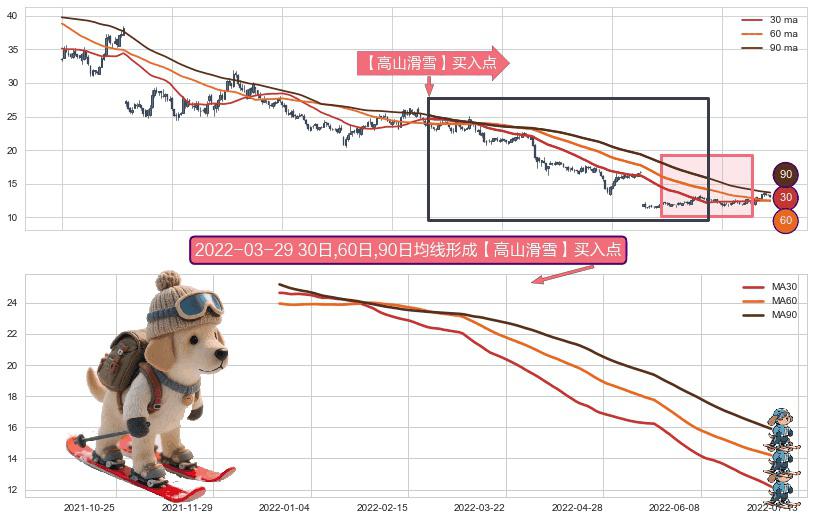 ⚀ 2021-12-22日-2022-07-04日显现 30日-60日-90日均线 【高山滑雪】买入点 看多信号,后市看涨,买入