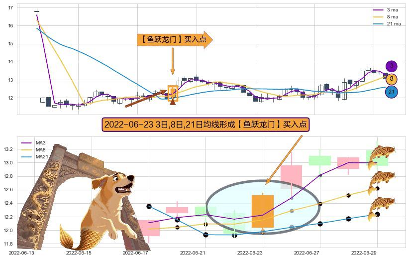 ⚀ 2022-06-23日显现 3日-8日-21日均线 【鱼跃龙门】买入点 看多信号,后市看涨,买入