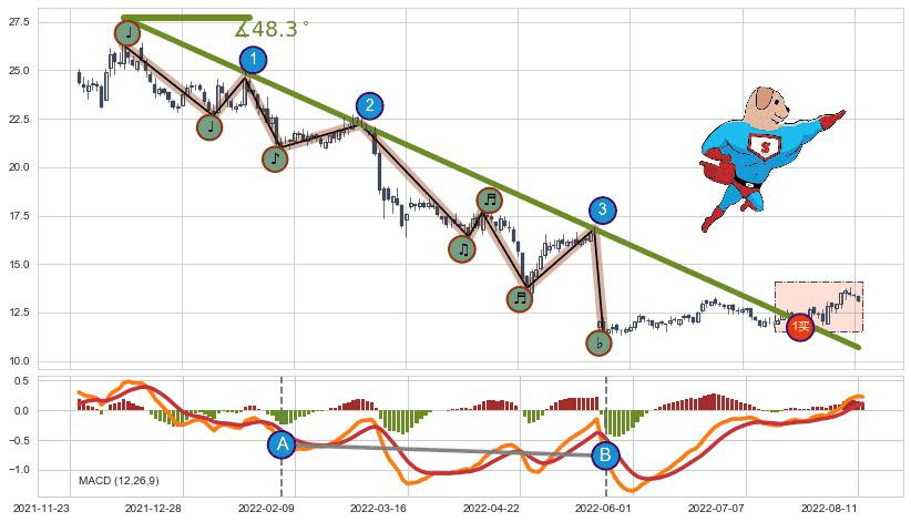 从2021-12-09至2022-05-27,共包含111个交易日,阶段股价下跌-72.95%,阶段股价变动位移路程比: 1 : 3,下跌趋势角度: 48.3,2022-05-23向↘︎形成缺口,跳空下跌-28.50%˚