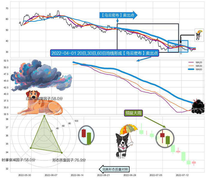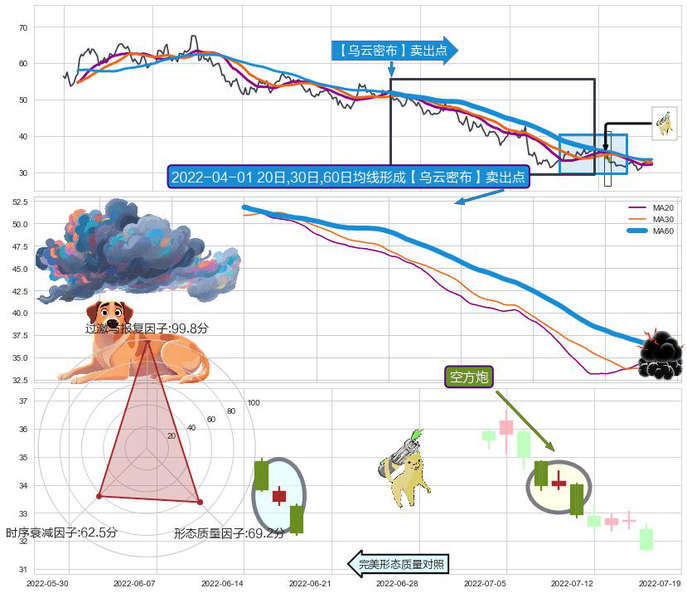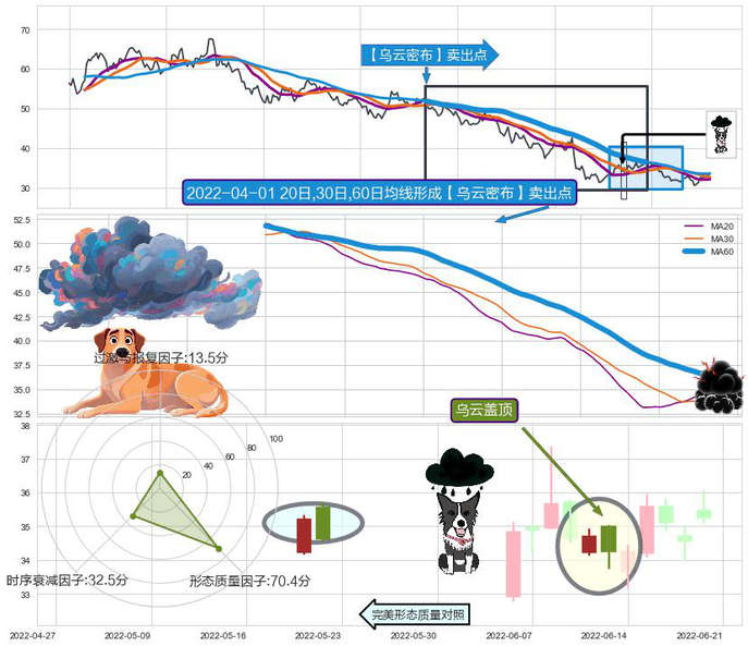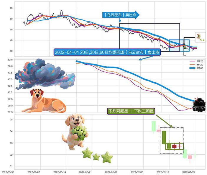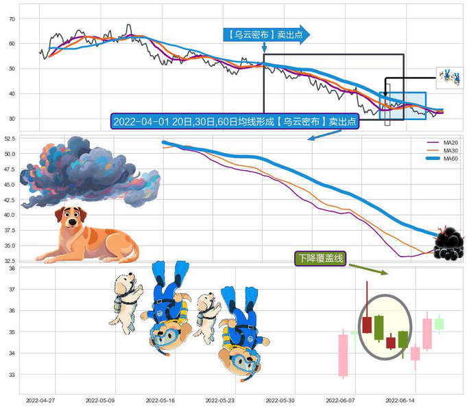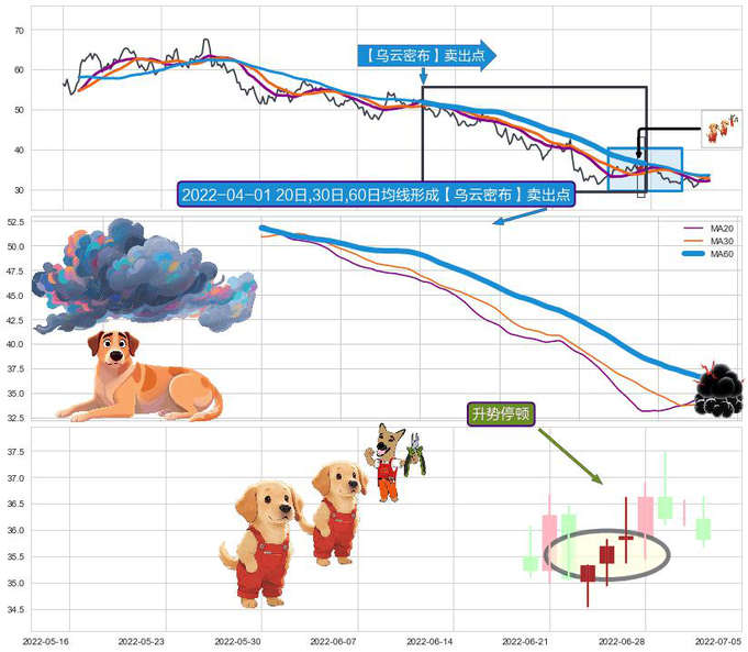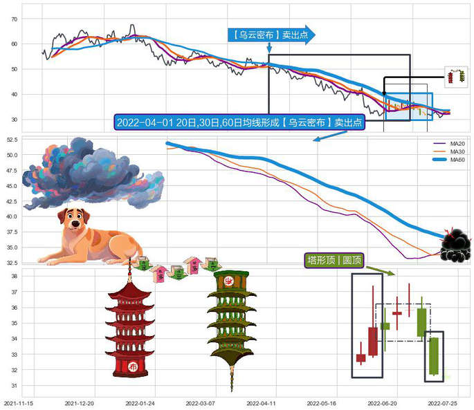 ➣ 2022-01-05日-2022-06-28日显现 20日-30日-60日均线 【乌云密布】卖出点 看空信号,后市看跌,卖出