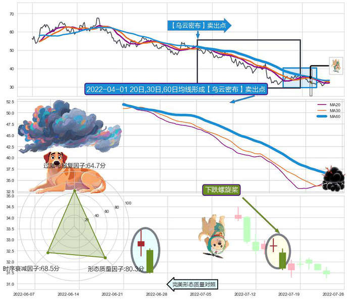 ➣ 下跌螺旋桨 + 【乌云密布】卖出点乌云密布空头中继卖出点信号叠加后【信号初始稳固度】中等,【看空】信号叠加【可信度影响中等】