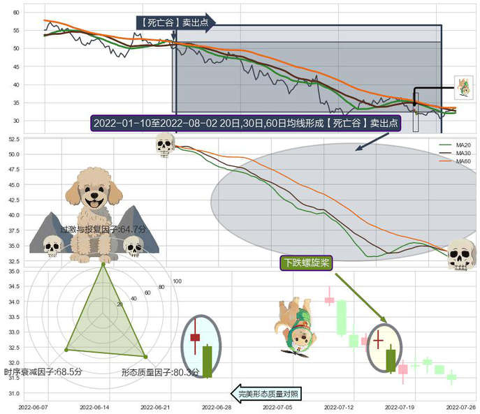 ➣ 下跌螺旋桨 + 【死亡谷】卖出点死亡谷均线交叉卖出点信号叠加后【信号初始稳固度】中等,【看空】信号叠加【可信度影响中等】