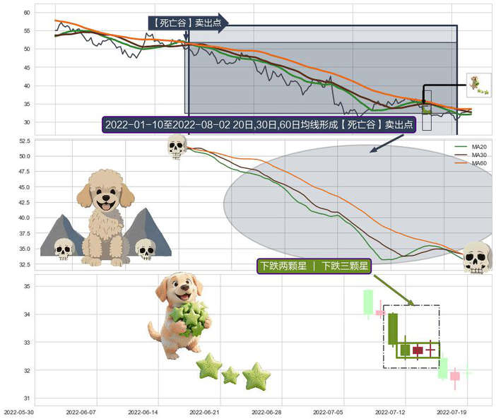 ➣ 下跌两颗星 | 下跌三颗星 + 【死亡谷】卖出点死亡谷均线交叉卖出点信号叠加后【目标达成率】中等,【看空】信号叠加【存续影响中等】