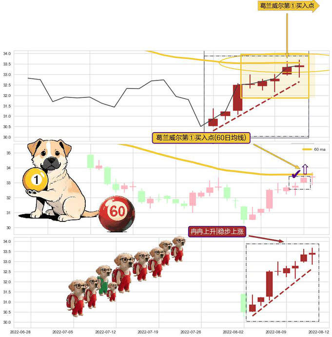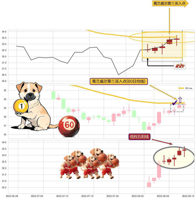 ➣ 2022-08-11-日显现 葛兰威尔均线 60日均线 第买①入点 走势反转见底信号,后市看涨,买进信号