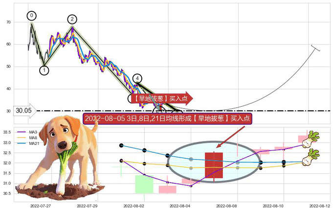 ➣ 🕰 价格走势在2022-08-05至2022-08-05期间形成【旱地拔葱】买入点,残存影响值:28.28