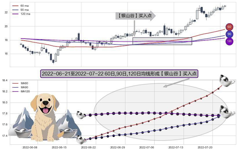 形态多维评估: ⚀ 2022-06-22-日至2022-07-22-日显现 60日-90日-120日均线 【银山谷】买入点 看多信号,后市看涨,买入