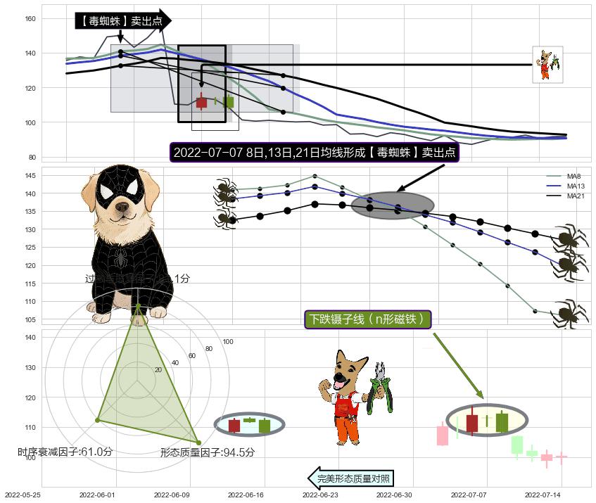 从2021-08-31至2022-08-11,共包含229个交易日,阶段股价下跌-68.82%,阶段股价变动位移路程比: 1 : 8,下跌趋势角度: 27.8,2022-07-04向↘︎形成缺口,跳空下跌-29.71%˚