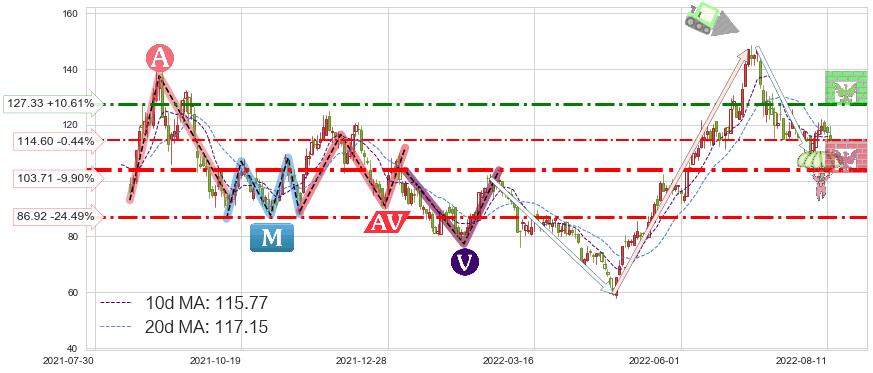 ♘ 阻力价格位127.33,可信任强度63.41%,距离最后交易2022-08-12形成的收盘价格115.11相差 +10.61%