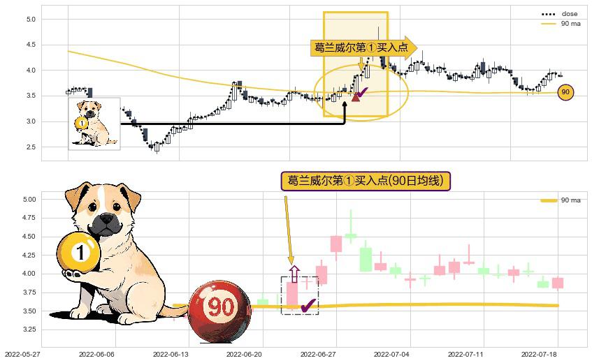形态多维评估: ⚀ 2022-06-22-日显现 葛兰威尔均线 90日均线 第买①入点 走势反转见底信号,后市看涨,买进信号