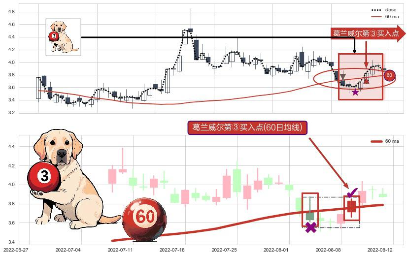 形态多维评估: ⚀ 2022-08-09-日显现 葛兰威尔均线 60日均线 第③买入点 上升趋势的中继信号,后市看涨,买进信号