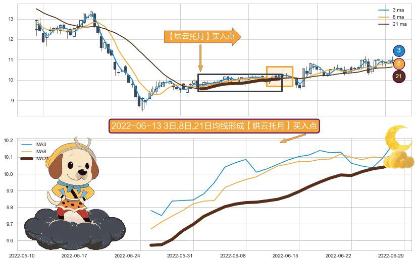 ⚀ 2022-05-25日-2022-06-28日显现 3日-8日-21日均线 【烘云托月】买入点 看多信号,后市看涨,买入