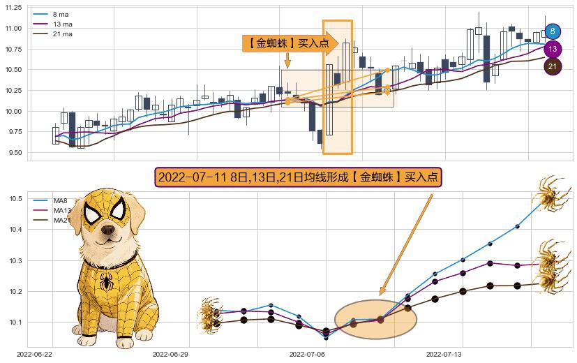 ⚀ 2022-07-11日显现 8日-13日-21日均线 【金蜘蛛】买入点 看多信号,后市看涨,买入