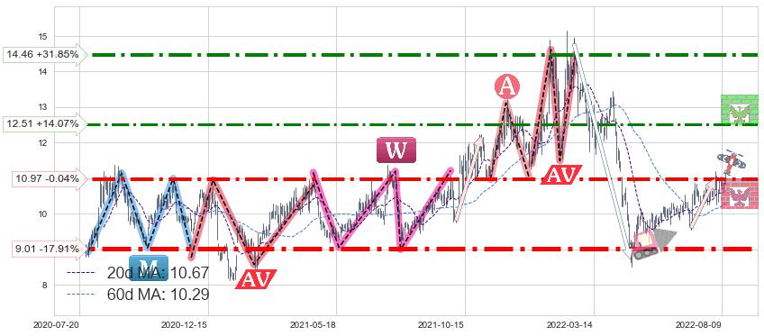 ♘ 支撑价格位10.97,可信任强度81.29%,距离最后交易2022-08-12形成的收盘价格10.97相差 -0.04%