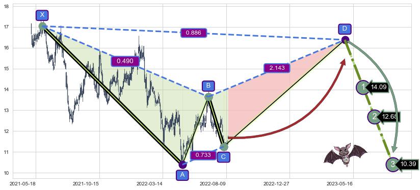 ➣ 未完成【蝙蝠】形态起点X: 2021-06-01, 已到达C点: 2022-08-03, 预测最终D点: 2023-04-27, 共478交易日