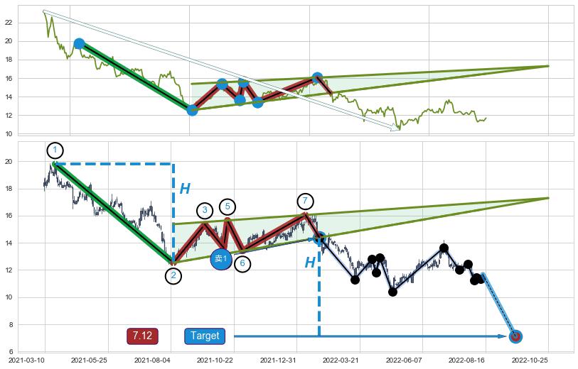 ➢ 最小中继整理跌幅→𝐇: 7.27 (𝐇楔型旗杆的长度:楔型起点→顶点)