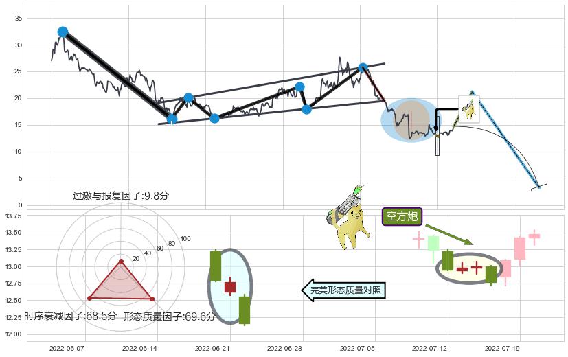 | 3 🅚:【绝命跳】卖出点 ➕ 📐:升旗形下行突破支撑位破位, 猜想持续下沉下跌,被突破的支撑位已变为阻力位 ☞ 看空信号 ⇥ 【均线】交织【图形】⇥ 综合量化分数: 33 | > |