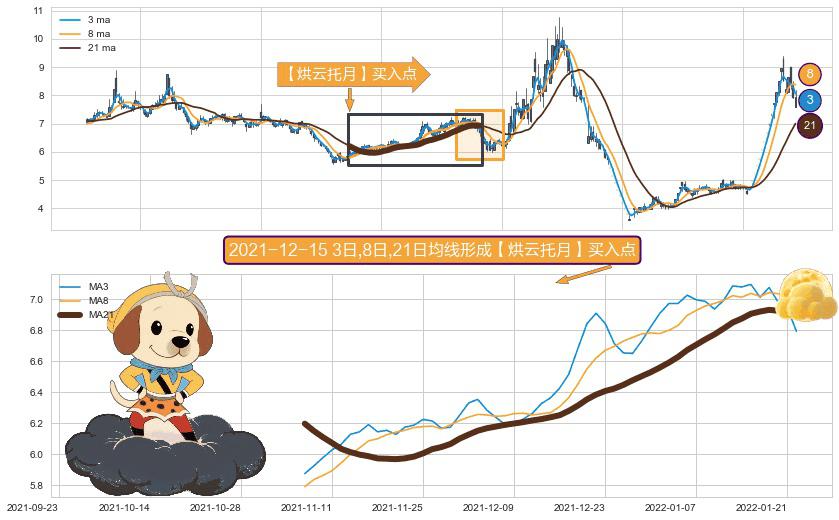 ⚀ 2021-11-08日-2022-01-24日显现 3日-8日-21日均线 【烘云托月】买入点 看多信号,后市看涨,买入