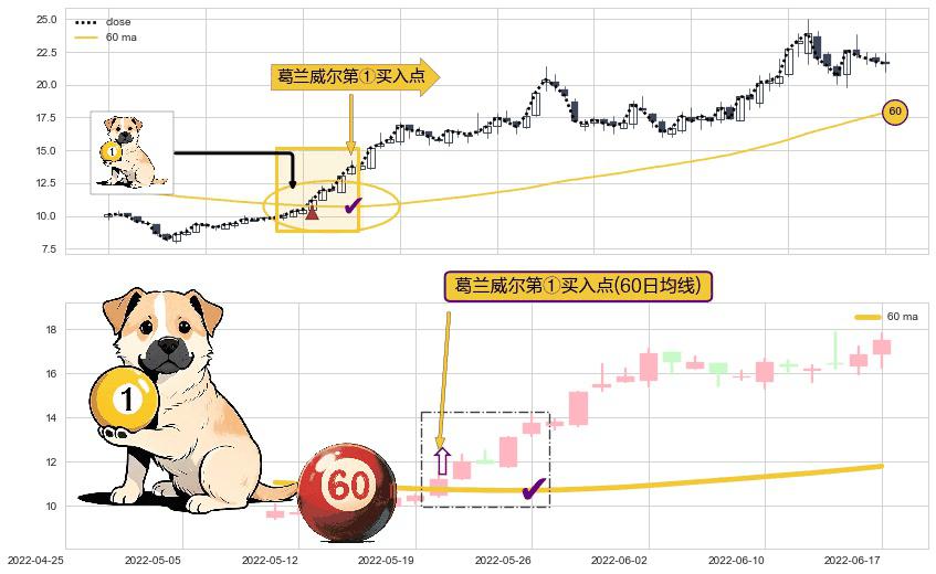 形态多维评估: ⚀ 2022-05-20-日显现 葛兰威尔均线 60日均线 第买①入点 走势反转见底信号,后市看涨,买进信号
