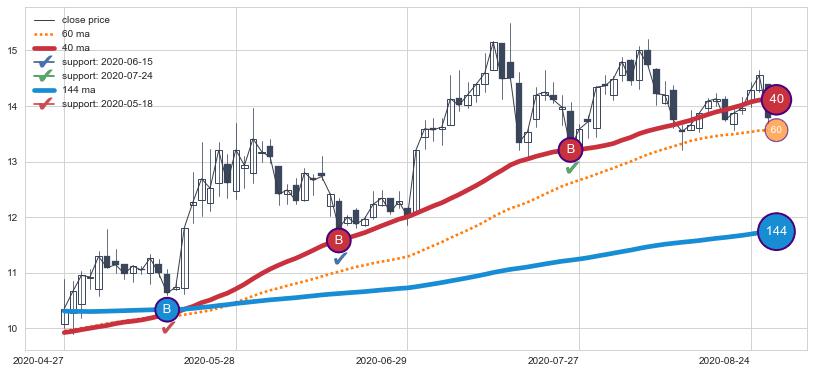 上涨趋势2020-04-27-2020-08-26,均线40, 144确认关键支撑3处