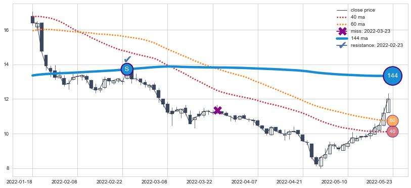 下跌趋势2022-01-18-2022-05-23,均线144确认关键阻力1处