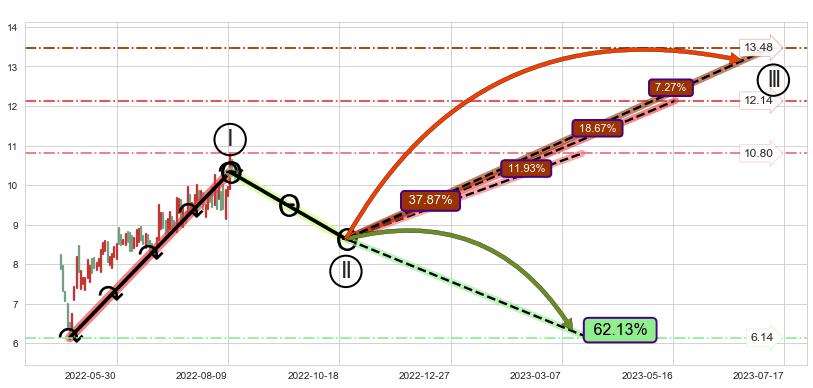 ➢ 循环浪继续向上【最低】位置(2023-03-20, 10.80),匹配聚类样本比例31.50%, 可能性概率11.93%