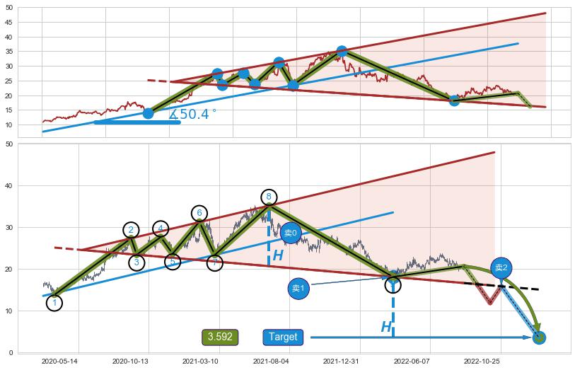 ➢ 最小反转跌幅→𝐇: 14.52 (逐步抬高阻力斜边最后的阻力点⑧与支撑边垂直距离)