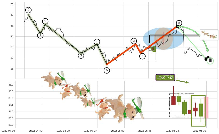 ➣ 【中枢B】:2022-02-11-2022-03-01,中枢由4笔构成,共13交易日, ZG=35.20, ZD=33.45