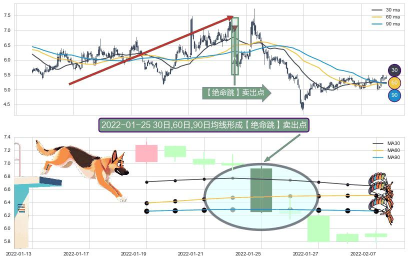 ⚀ 2022-01-25日显现 30日-60日-90日均线 【绝命跳】卖出点 看空信号,后市看跌,卖出