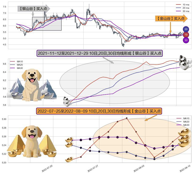 ⚃ 2022-07-26-日至2022-08-09-日显现 10日-20日-30日均线 【金山谷】买入点 其再次确认了买入信号,可靠性更强,买入
