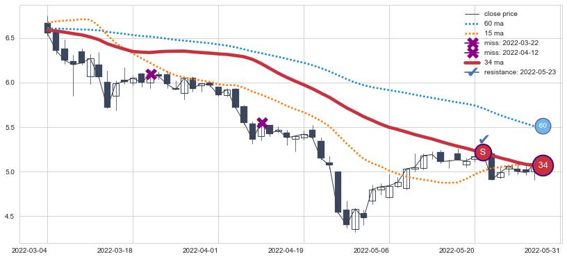 ⚂ 2021-11-16-日均线向上突破,2022-03-14-日重新下穿均线破位,均线阻力再次生效