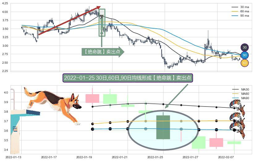 ⚀ 2022-01-25日显现 30日-60日-90日均线 【绝命跳】卖出点 看空信号,后市看跌,卖出