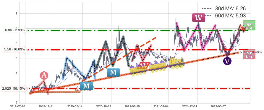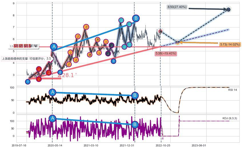 ♘ 支撑价格位5.56,可信任强度92.78%,距离最后交易2022-08-12形成的收盘价格6.67相差 -16.63%