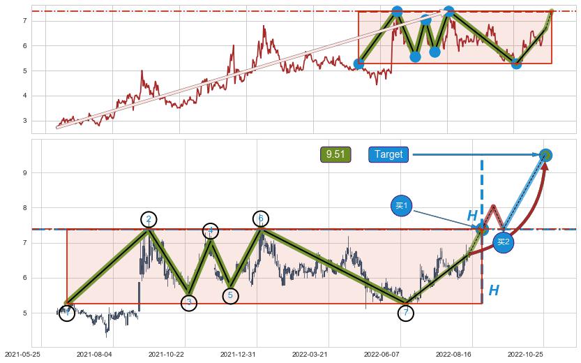 ➢ 【仅预测突破】最后价格:6.67与预测突破价格:7.39→【空间临近】后续最小【整理】第一目标价格→(2022-10-26: 9.51 )