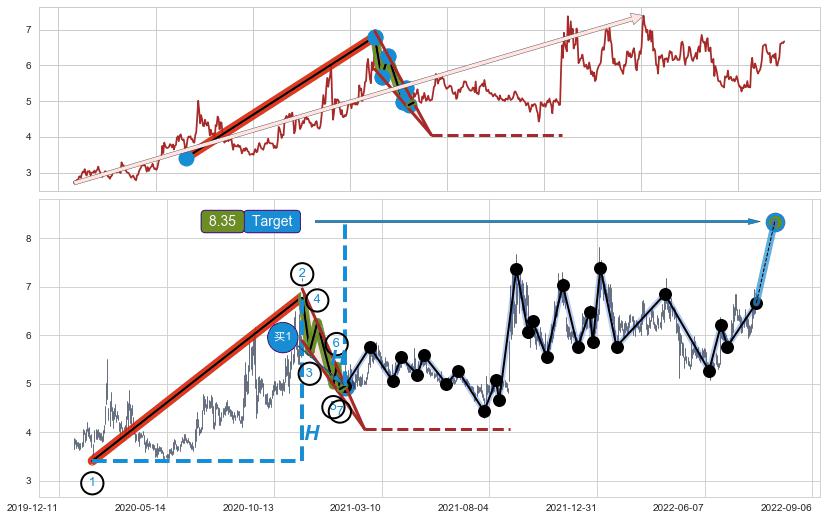 ➣ 最小中继整理涨幅→𝐇: 2.120 (上平行阻力线与下平行支撑线的垂直距离)