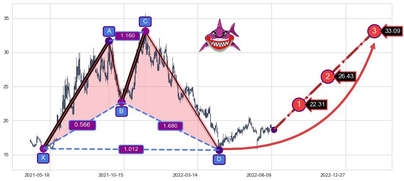 ➣ 已完成【鲨鱼】形态起点X: 2021-04-30, 终点D: 2022-04-26, 共239交易日